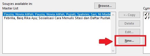 • Word akan menampilkan jendela manajemen sumber atau referensi. Selanjutnya, silahkan klik tombol “New” yang ada di bagian tengah.
