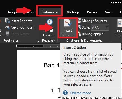 Menuliskan sitasi pada kutipan tentunya tidak harus diketik manual. Melainkan bisa menggunakan fitur tertentu yang disediakan aplikasi olah kata yang digunakan. Pada aplikasi olah kata Ms Word terdapat fitur otomatis untuk sitasi dan daftar pustaka. Berikut penjelasannya:
