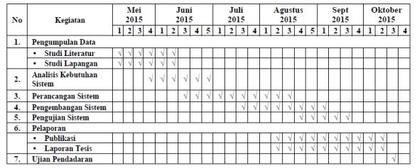 Jadwal penelitian berisi rencana jadwal kegiatan penelitian. Mencakup kegiatan penelitian apa saja, dilakukan kapan, dan berapa lama durasi pengerjaannya. Biasanya disajikan dalam bentuk tabel, berikut contohnya: